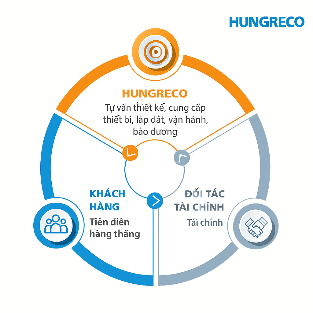 Bằng cách tận dụng phần diện tích mái nhàn rỗi, doanh nghiệp sẽ được lắp hệ thống điện mặt trời mà không cần bỏ vốn. Toàn bộ kinh phí lắp đặt hệ thống sẽ do đối tác tài chính chi trả. DAT Solar sẽ là tổng thầu EPC cho dự án, khảo sát, thiết kế, cung cấp thiết bị, lắp đặt, vận hành và bảo dưỡng cho toàn hệ thống điện mặt trời. Hằng tháng, doanh nghiệp chỉ cần trả tiền điện từ hệ thống cho đối tác tài chính với giá thấp hơn giá của EVN. Khi kết thúc hợp đồng, doanh nghiệp có quyền ký thuê tiếp hoặc thừa hưởng lại hệ thống với giá tượng trưng 1 USD.