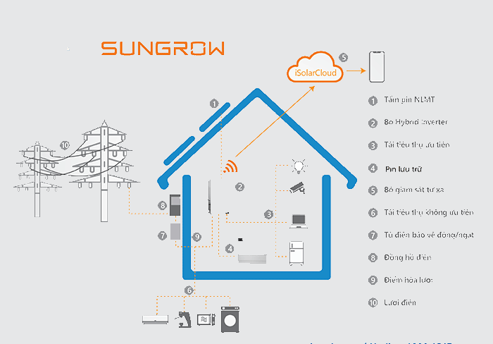 Hệ thống ưu tiên sử dụng nguồn điện năng lượng mặt trời để cung cấp cho các tải ưu tiên trong gia đình, đồng thời sạc đầy cho pin lưu trữ lithium.